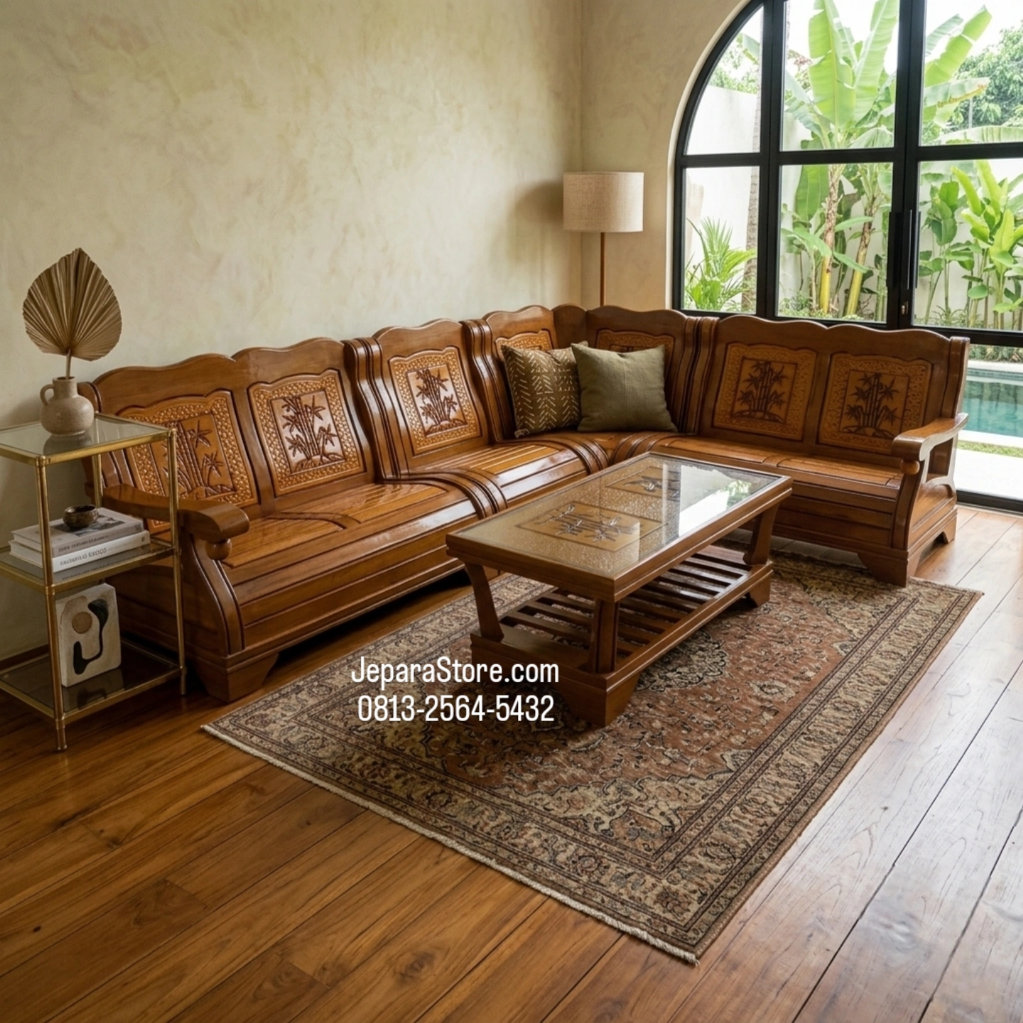 Set Kursi Tamu Sudut Gajah merupakan produk mebel Jepara yang terbuat dari kayu jati pilihan perajin berpengalaman menjadikan sebuah kursi tamu yang terbaik. Desain ukiran Kursi Tamu motif bambu dengan finishing melamin warna walnut. Warna finishing juga bisa menyeesuaikan dengan perabot furniture yang ada di ruangan.